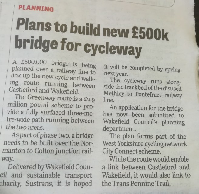 As reported in the Yorkshire Evening Post today, a new greenway is being built to link Castleford to Wakefield. The length is similar to that of our proposed Greenside Greenway and even features a new bridge, again, similar to what we would need.