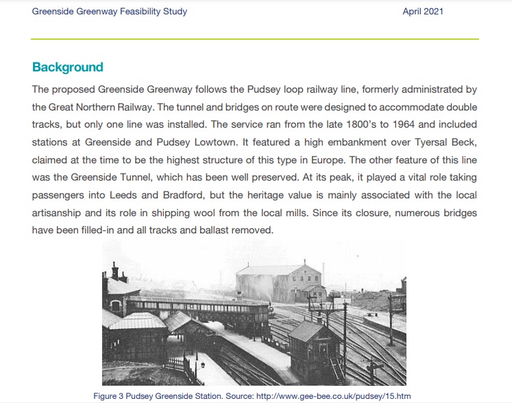 We are pleased to announce that the feasibility report into phase one of Greenside Greenway has now been completed by Sustrans. This was funded by local community donations and contributions from Historical Railway Estates, and both Leeds and Bradford Councils. Thank you to everyone that contributed, both in terms of finance and support.